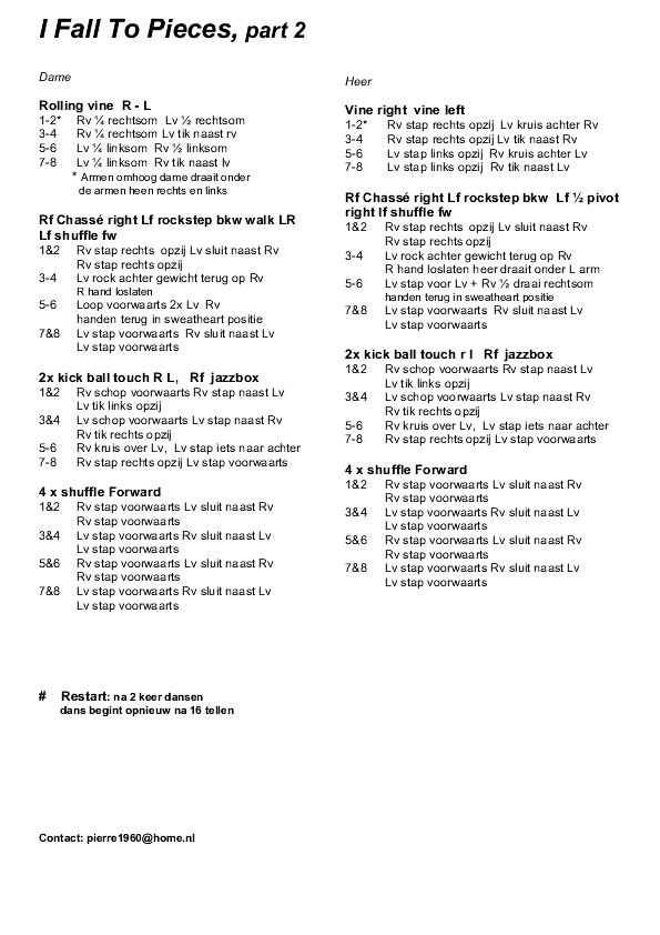 I Fall To Pieces (September 2016) Choreografie : Tonnie Vos Soort dans : Partnerdans Niveau : Intermediate Tellen : 64 Intro: 16 tellen