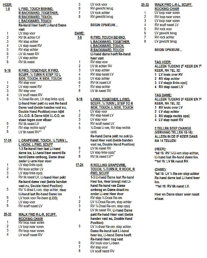 RIGHT OPEN PROMENADE POSITIE, Re-hand Heer heeft Li-hand dame vast LOD (tegen de klok in) Volgorde dans: 32- 32+TAG -32-32- 14+2 STAP VERANDERING-32- 32+TAG -32-32-32-32-32-14 einde dans!